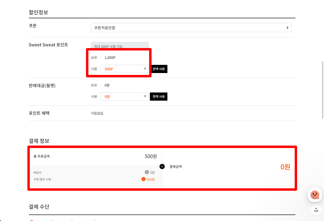 500포인트 사용으로 결제금액은 0원이 되었습니다.