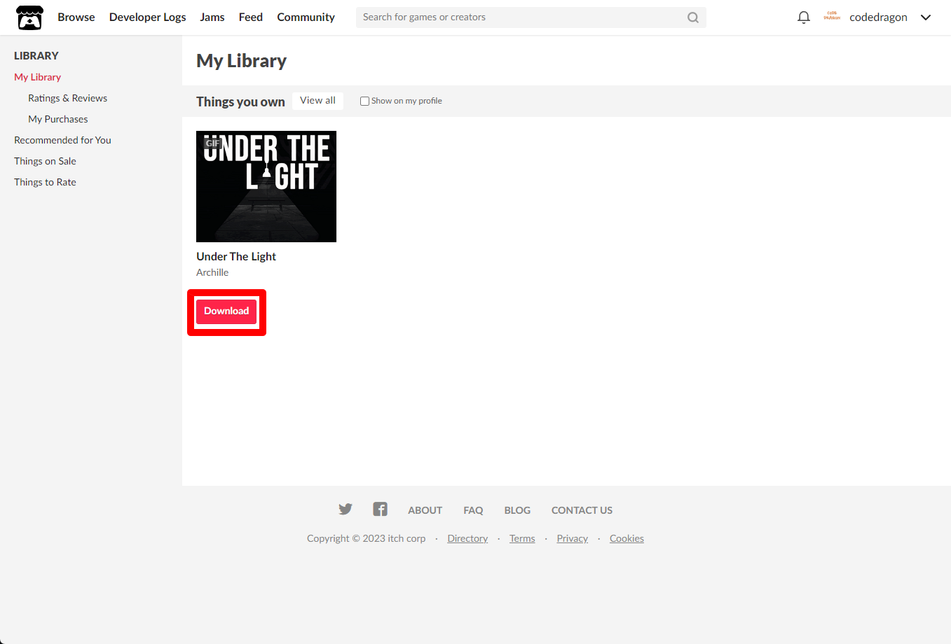 itch.io에서 받은 "Under The Light" 게임 확인하고 설치파일 다운받아 보겠습니다. 우측 상단의 나의 사용자명 오른쪽의 화살표 아이콘을 클릭합니다.