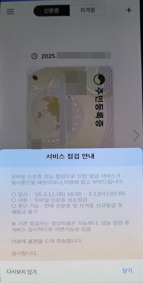 서비스 점검 안내 - 모바일 신분증 성능점검