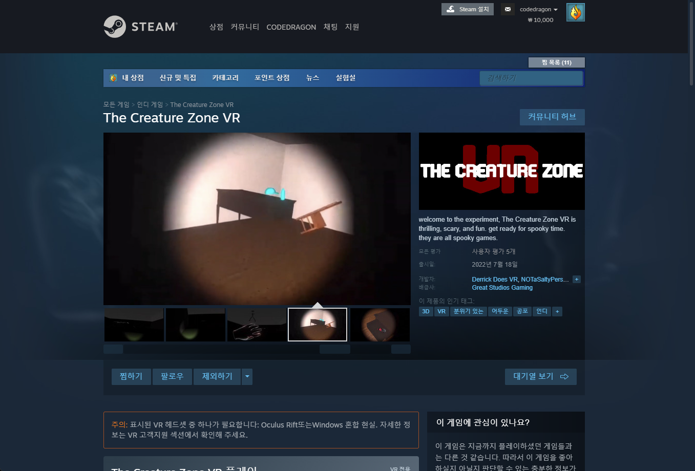 "The Creature Zone VR" 스팀 페이지 입니다.