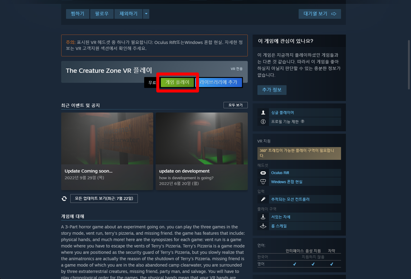 "The Creature Zone VR" 페이지를 내려 [게임 플레이]를 클릭하면 됩니다.