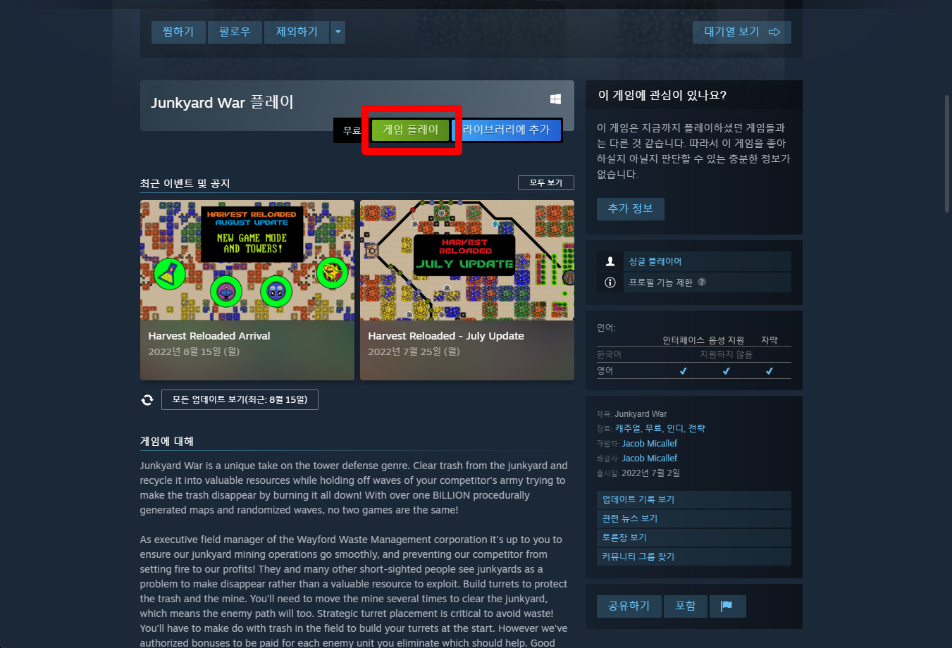 "Junkyard War" 페이지를 내려 [게임 플레이]를 클릭하면 됩니다.
