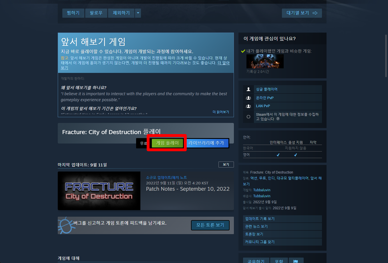 "Fracture: City of Destruction" 페이지를 내려 [게임 플레이]를 클릭하면 됩니다.