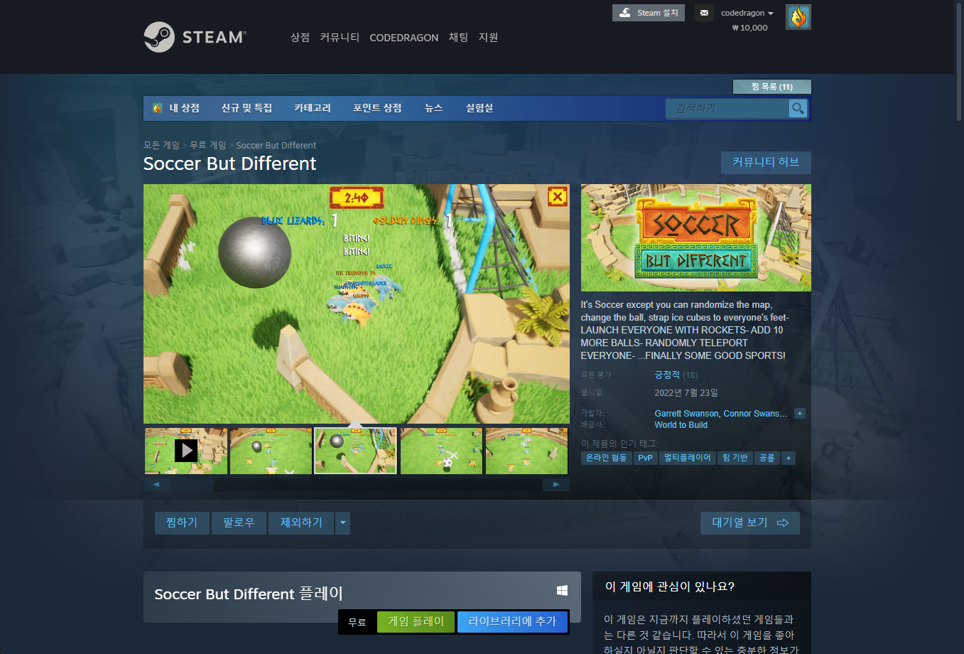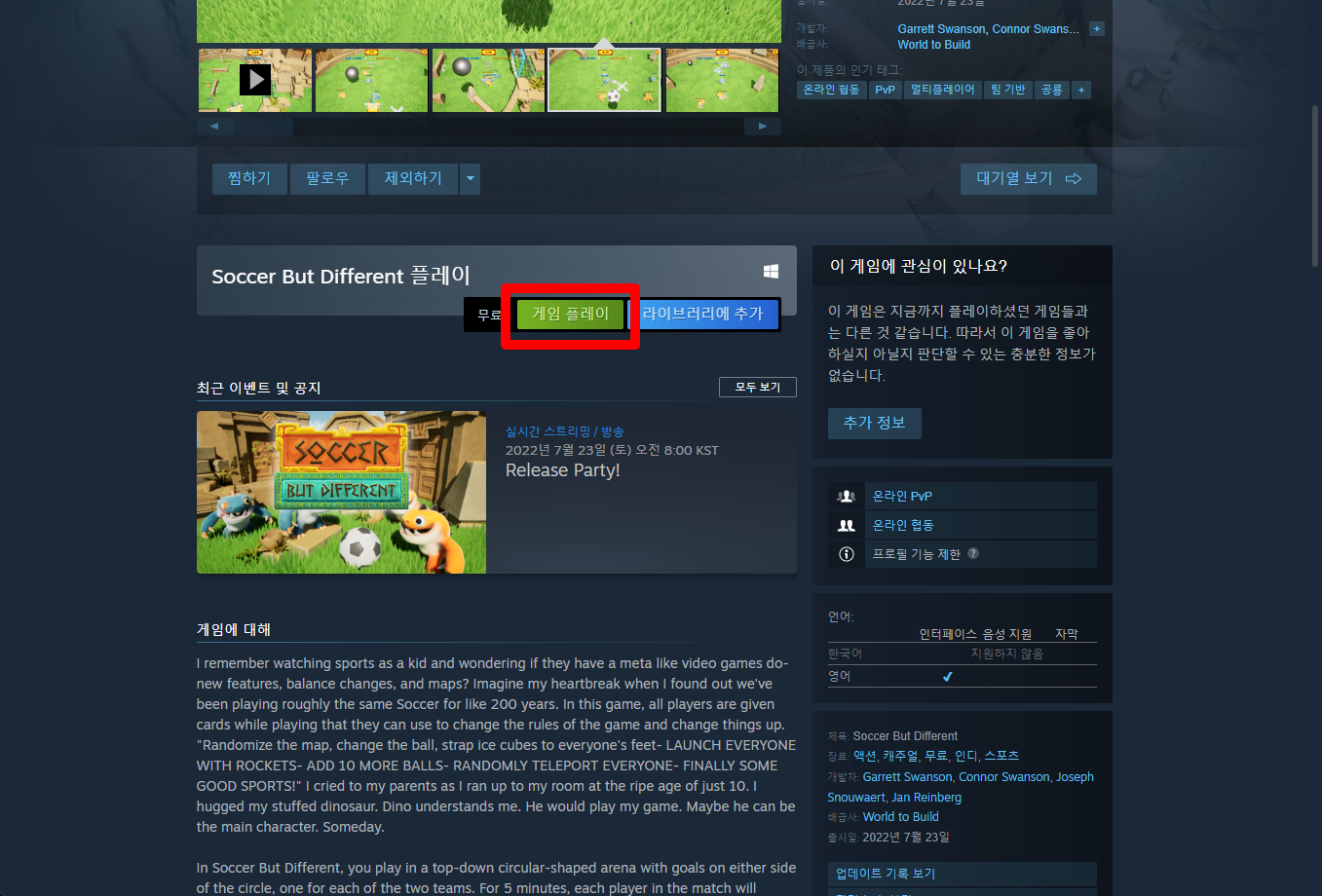 "Soccer But Different" 페이지를 내려 [게임 플레이]를 클릭하면 됩니다.