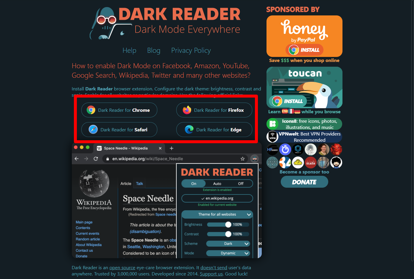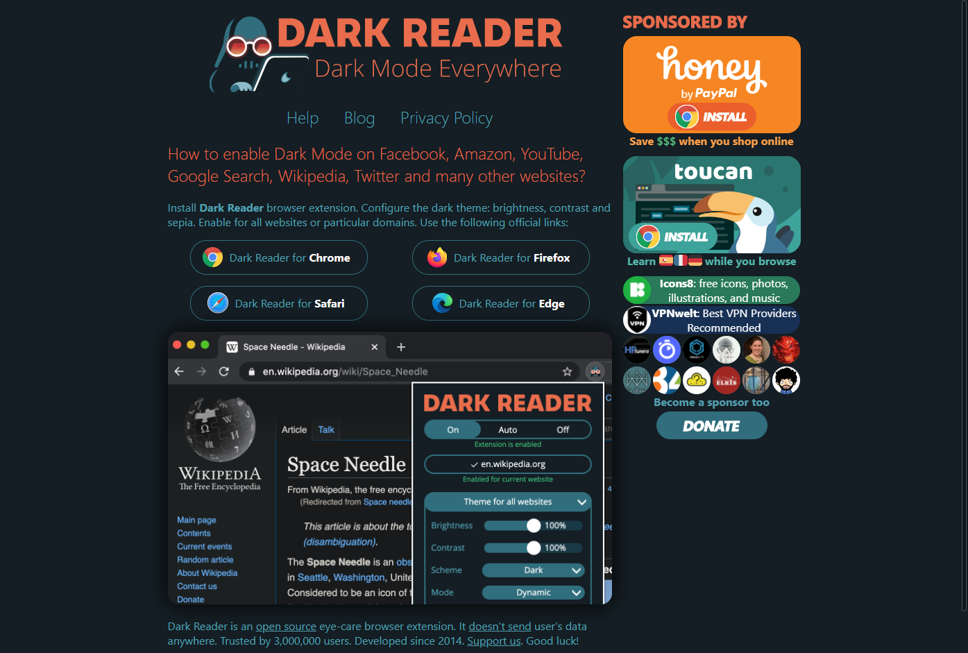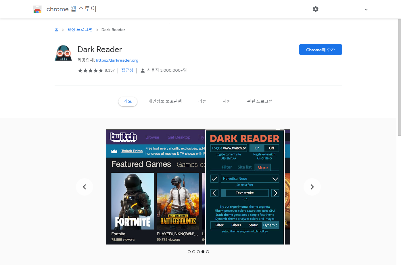 모든 웹사이트에 다크 모드(어두운 테마)를 사용해서 눈을 보호해 주는 크롬확장 프로그램입니다.
