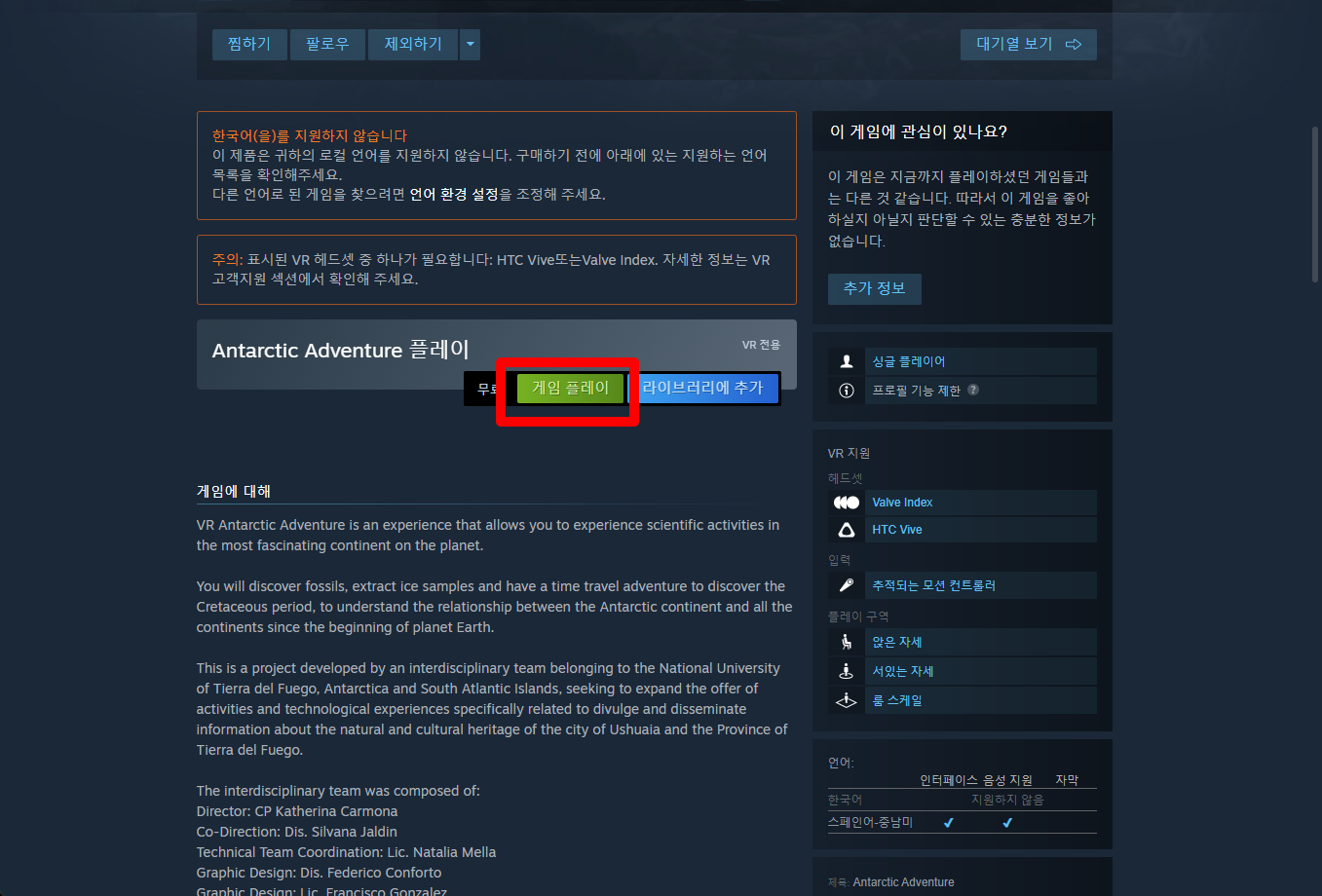 "Antarctic Adventure" 페이지를 내려 [게임 플레이]를 클릭하면 됩니다.