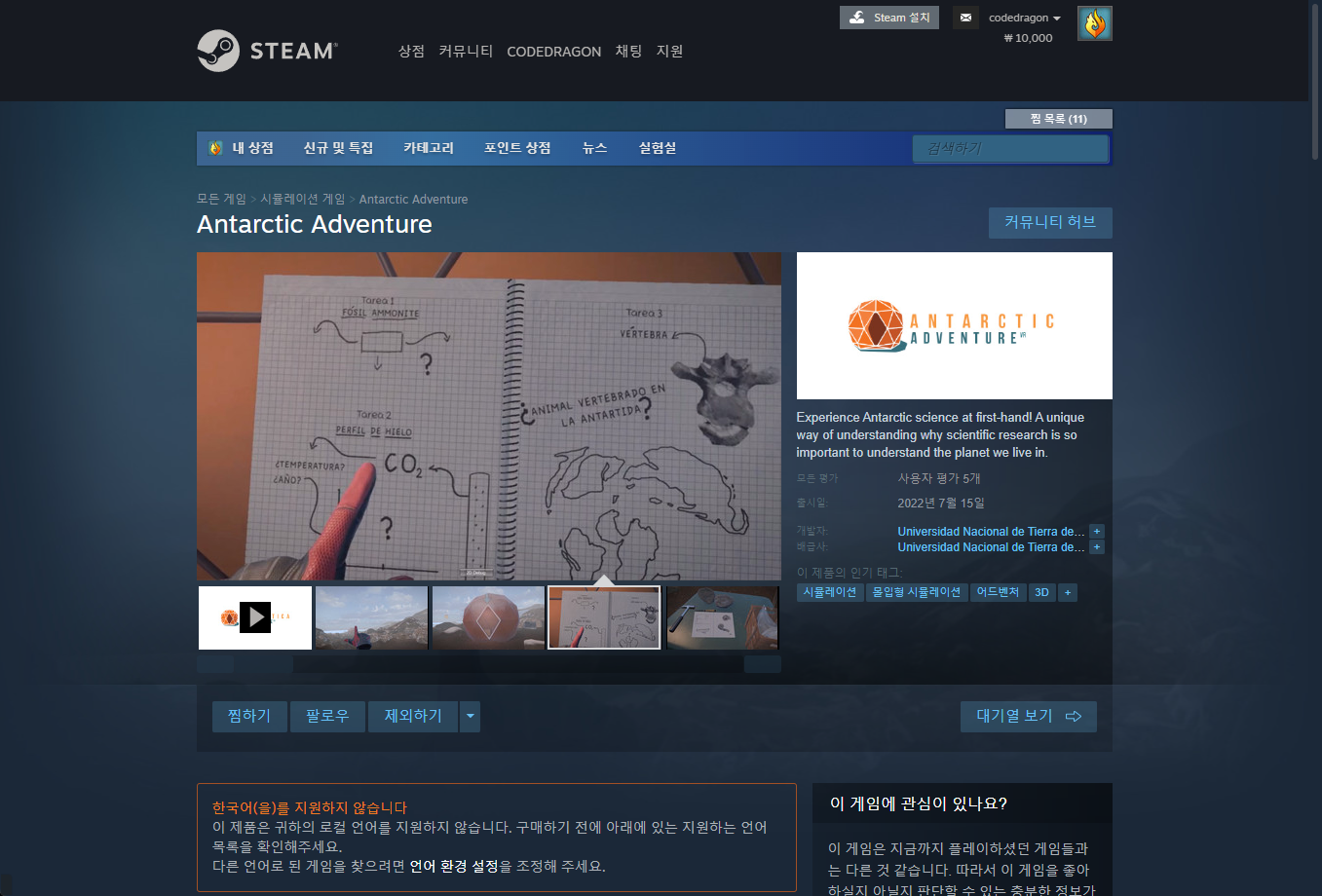 "Antarctic Adventure" 스팀 페이지 입니다.