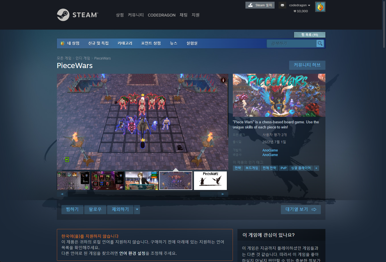 "PieceWars" 스팀 페이지 입니다.