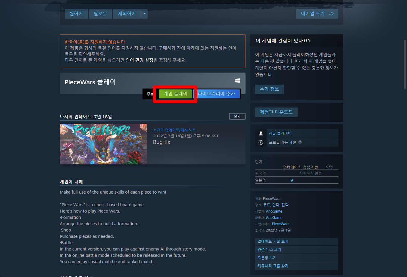 "PieceWars" 페이지를 내려 [게임 플레이]를 클릭하면 됩니다.