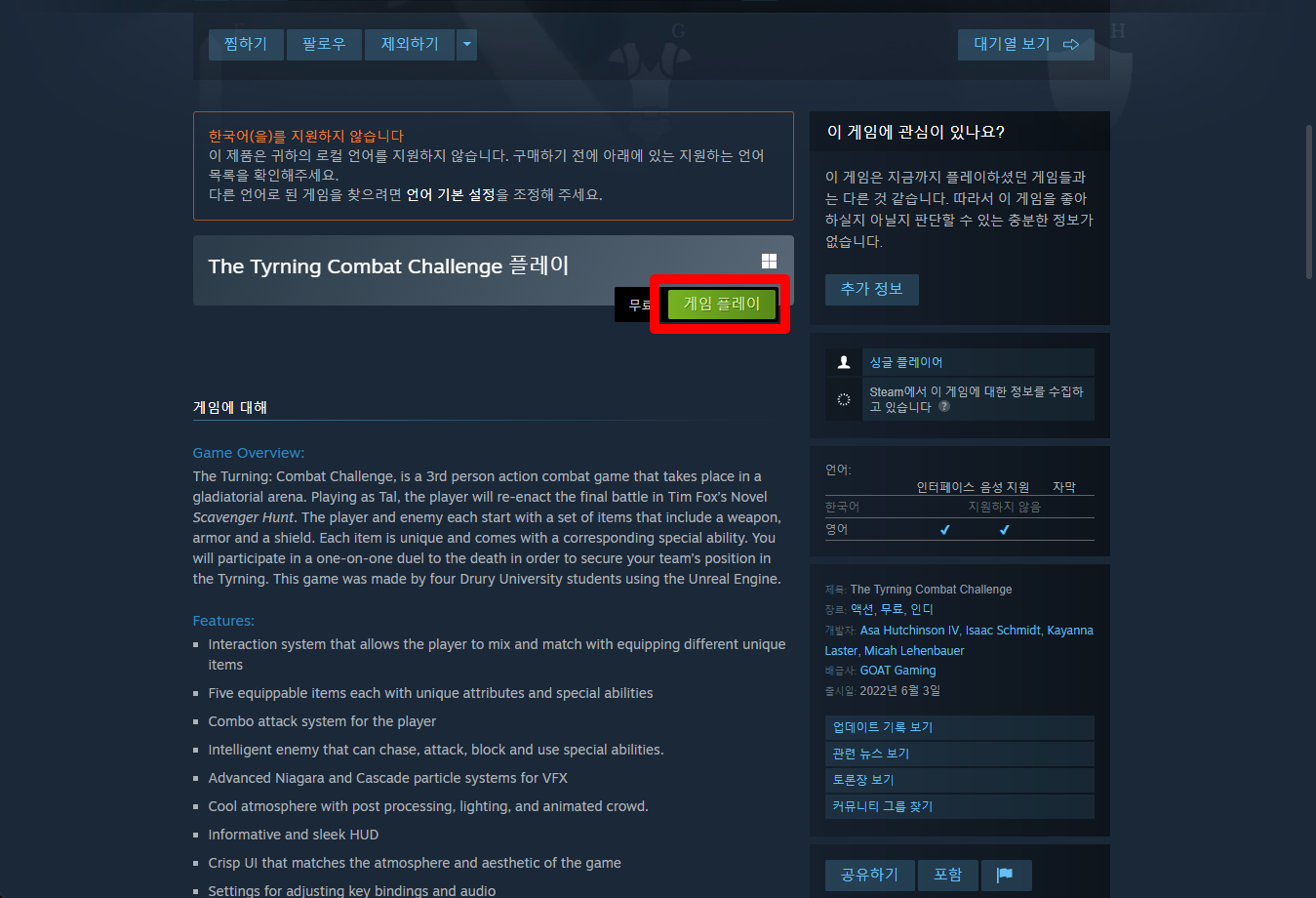 "The Tyrning Combat Challenge" 페이지를 내려 [게임 플레이]를 클릭하면 됩니다.