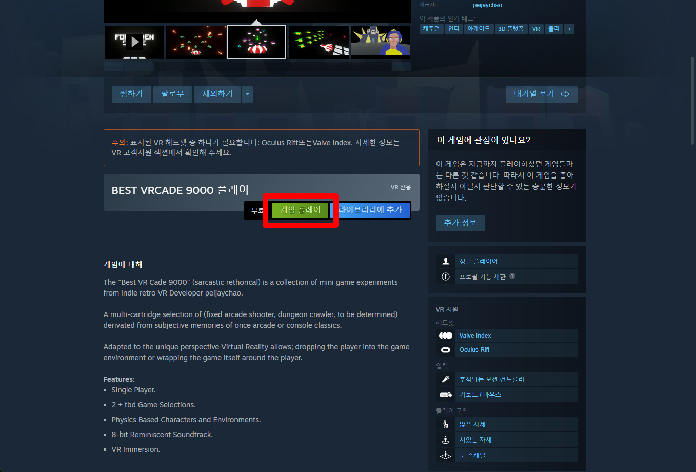 "BEST VRCADE 9000" 페이지를 내려 [게임 플레이]를 클릭하면 됩니다.