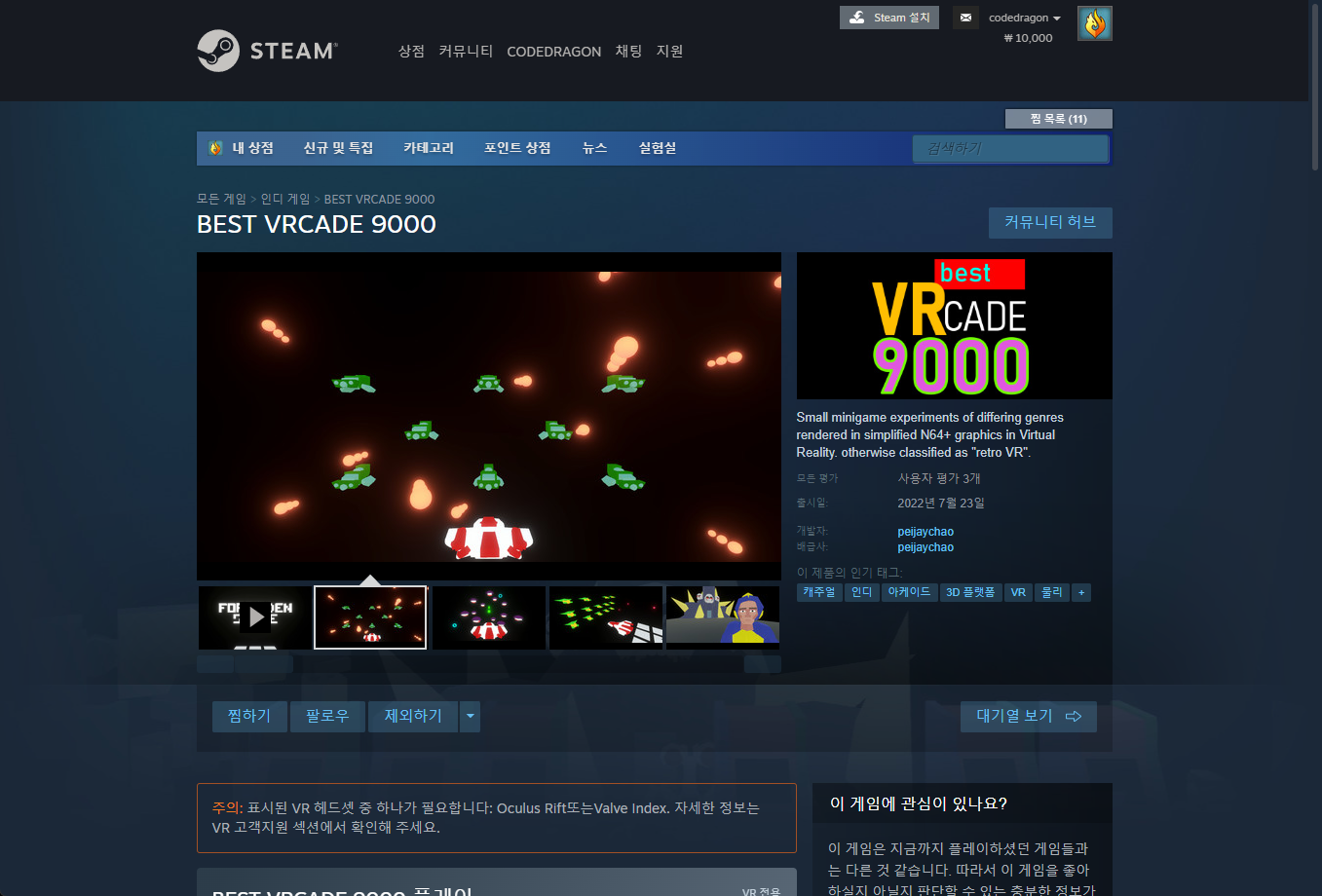 "BEST VRCADE 9000" 스팀 페이지 입니다.