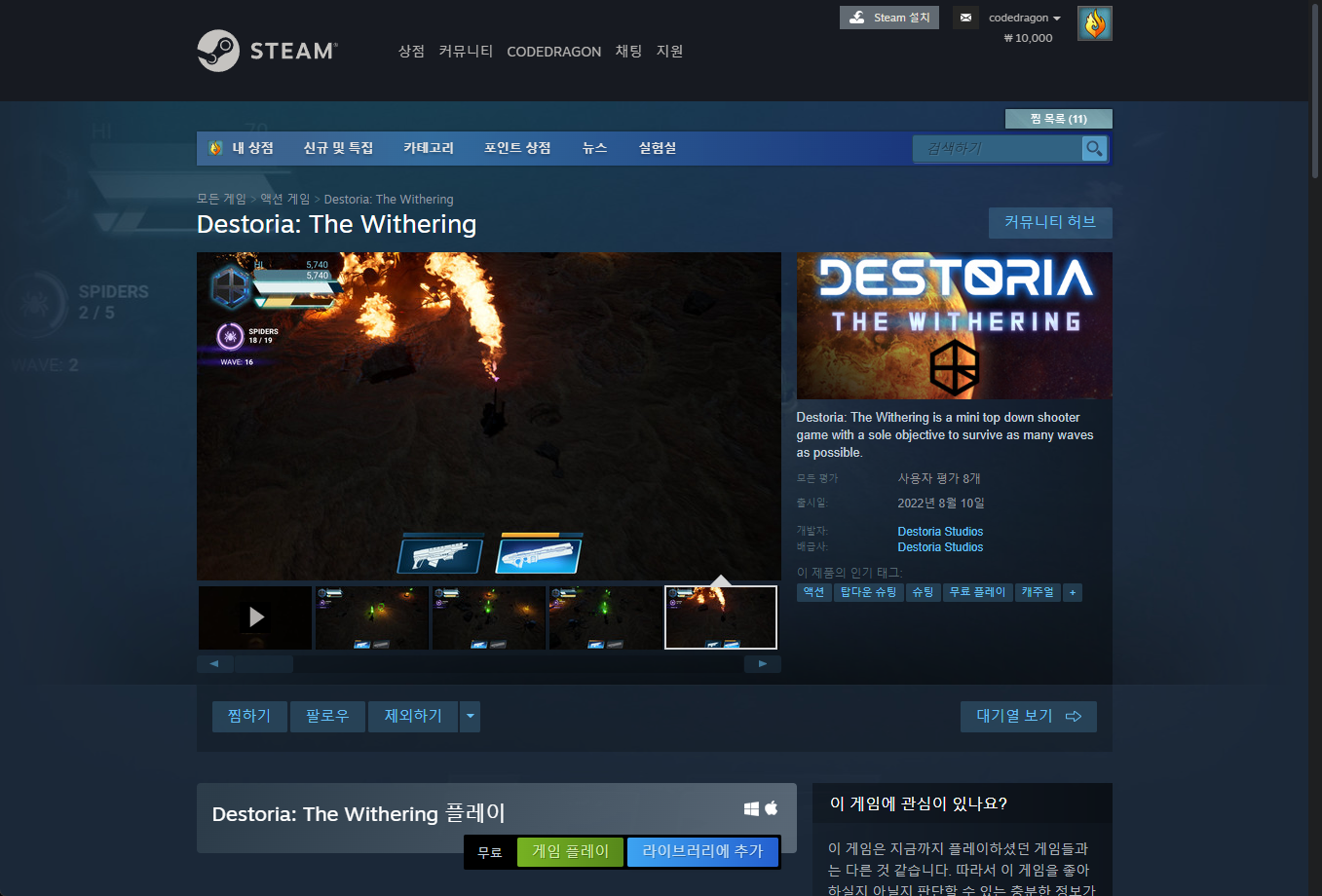 "Destoria: The Withering" 스팀 페이지 입니다.