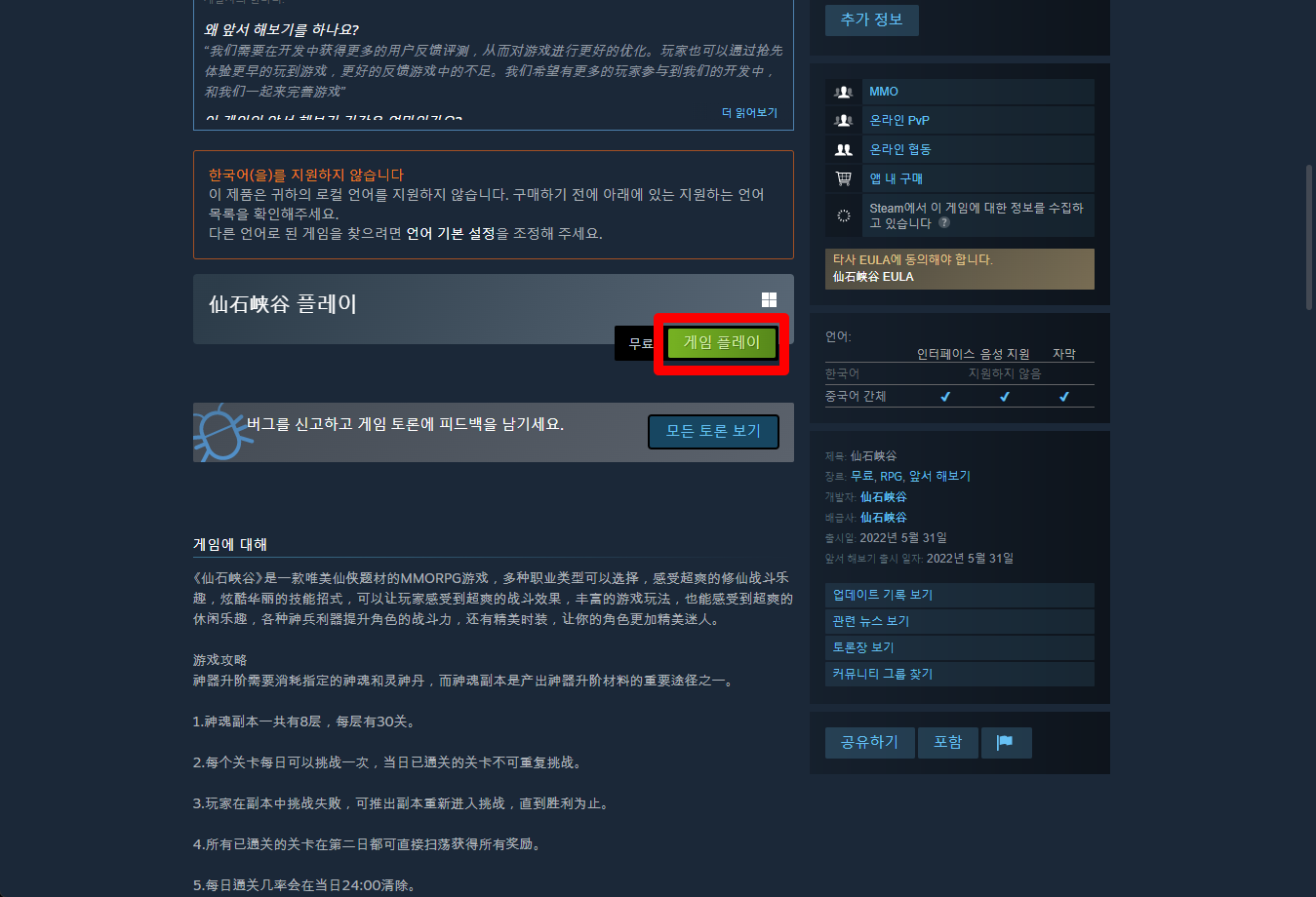 "仙石峡谷 선석협곡" 페이지를 내려 [게임 플레이]를 클릭하면 됩니다.