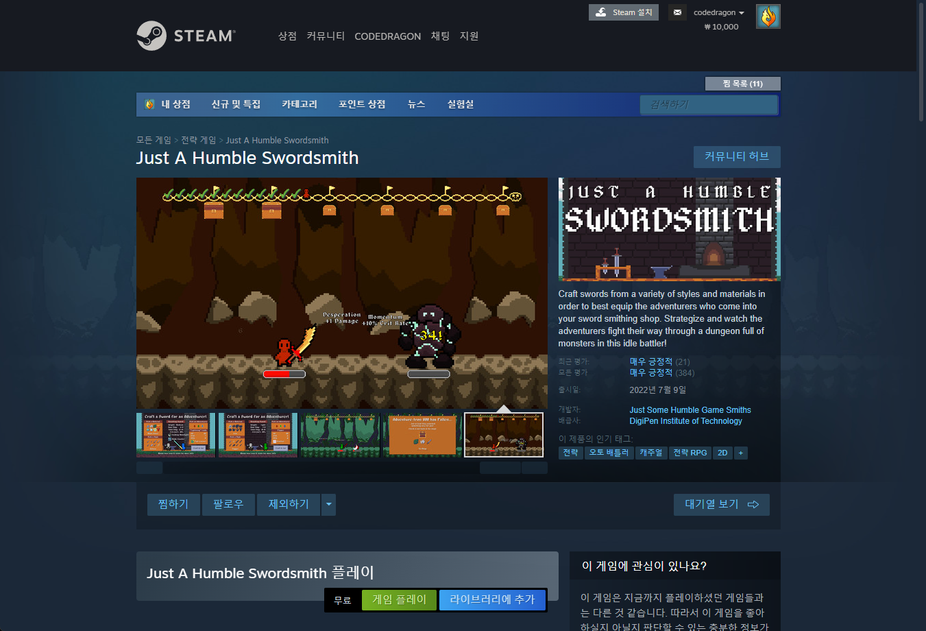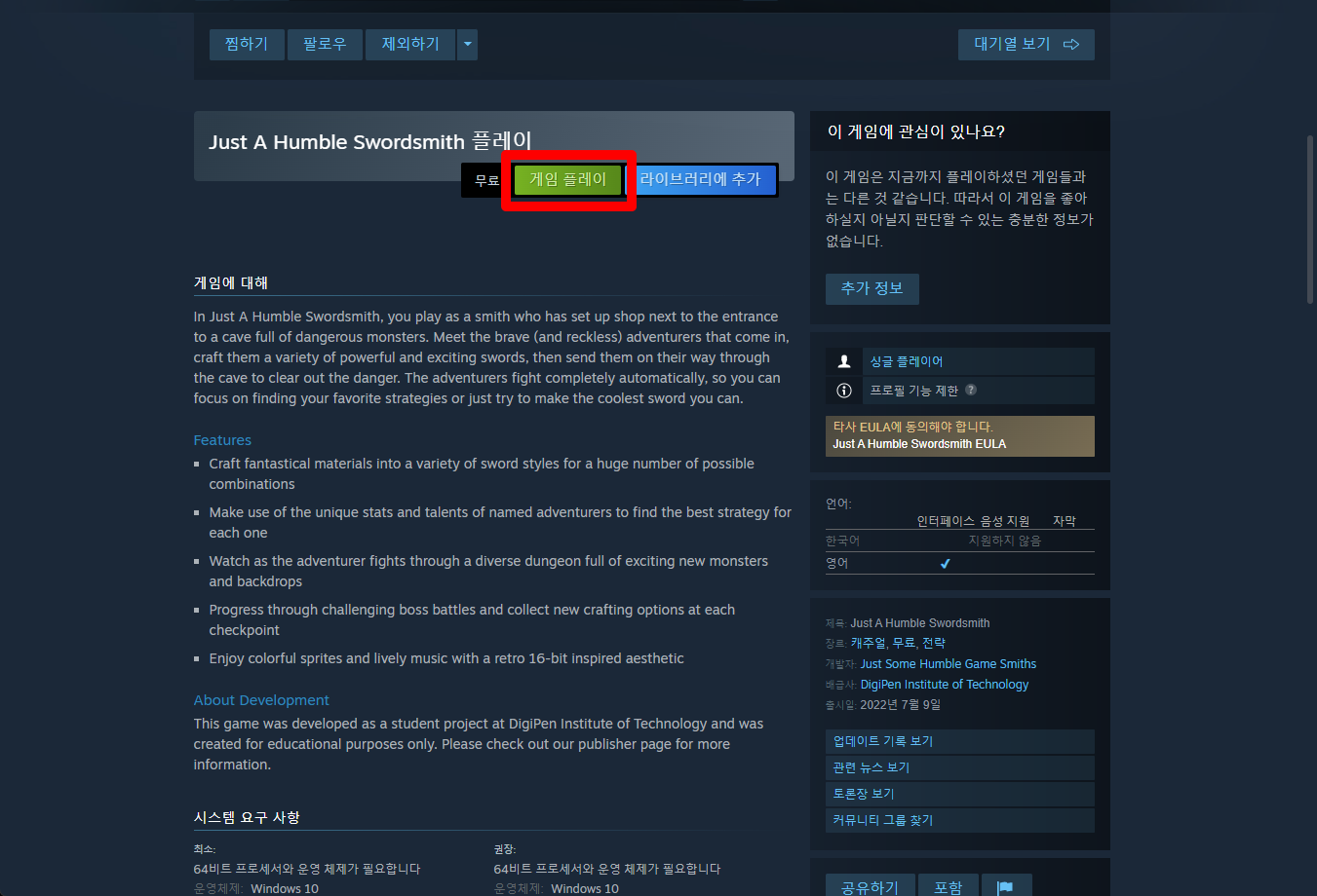 "Just A Humble Swordsmith" 페이지를 내려 [게임 플레이]를 클릭하면 됩니다.
