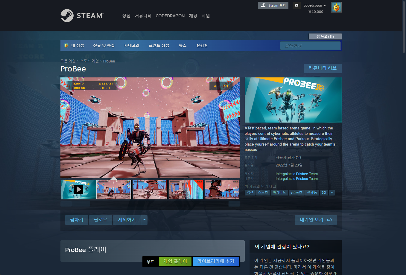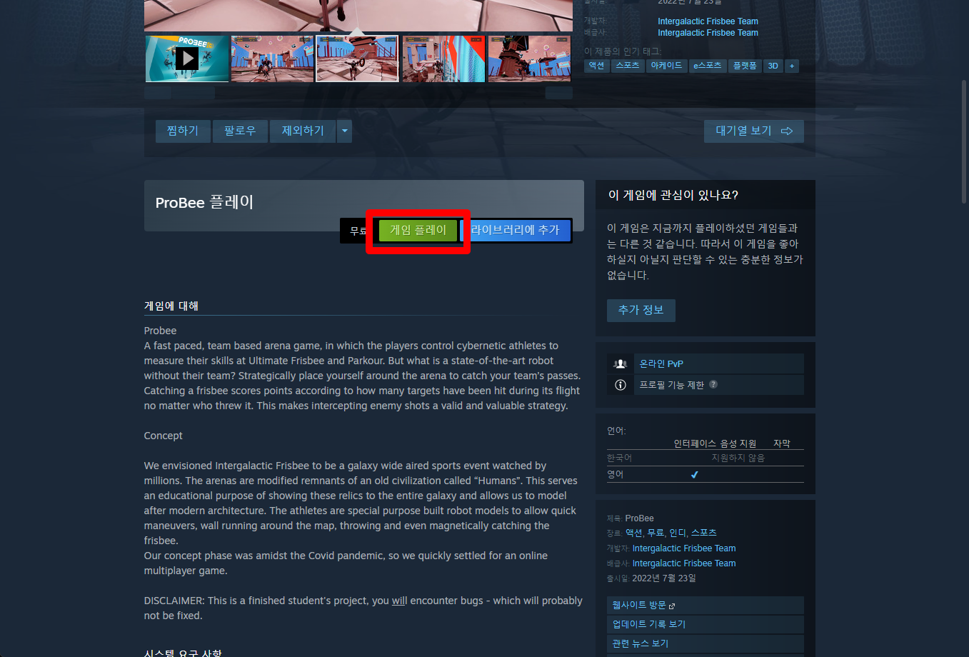 "ProBee" 페이지를 내려 [게임 플레이]를 클릭하면 됩니다.