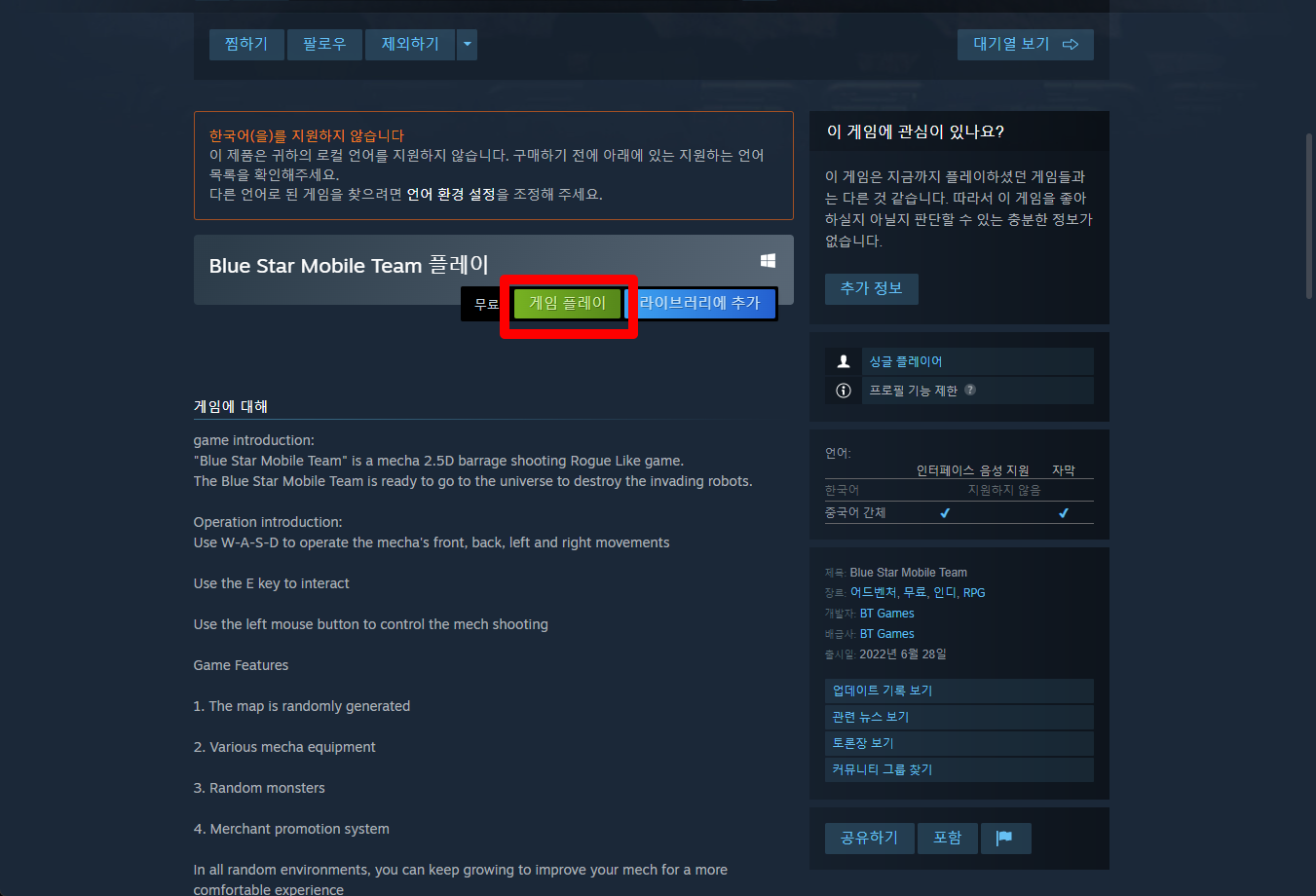"Blue Star Mobile Team 페이지를 내려 [게임 플레이]를 클릭하면 됩니다.