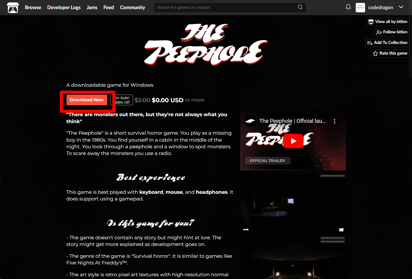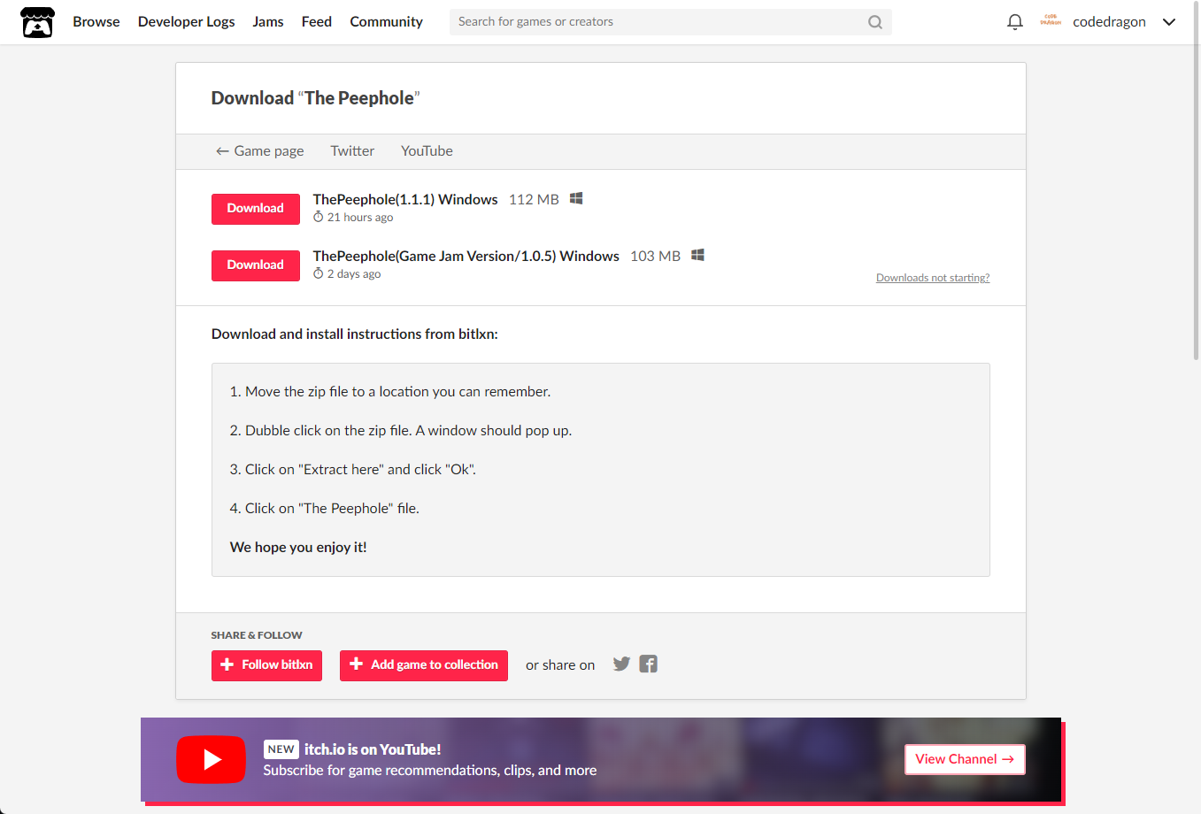 "The Peephole" 해당 항목에 있는 [Download] 버튼을 클릭하면 게임의 설치파일을 다운받을 수 있습니다.