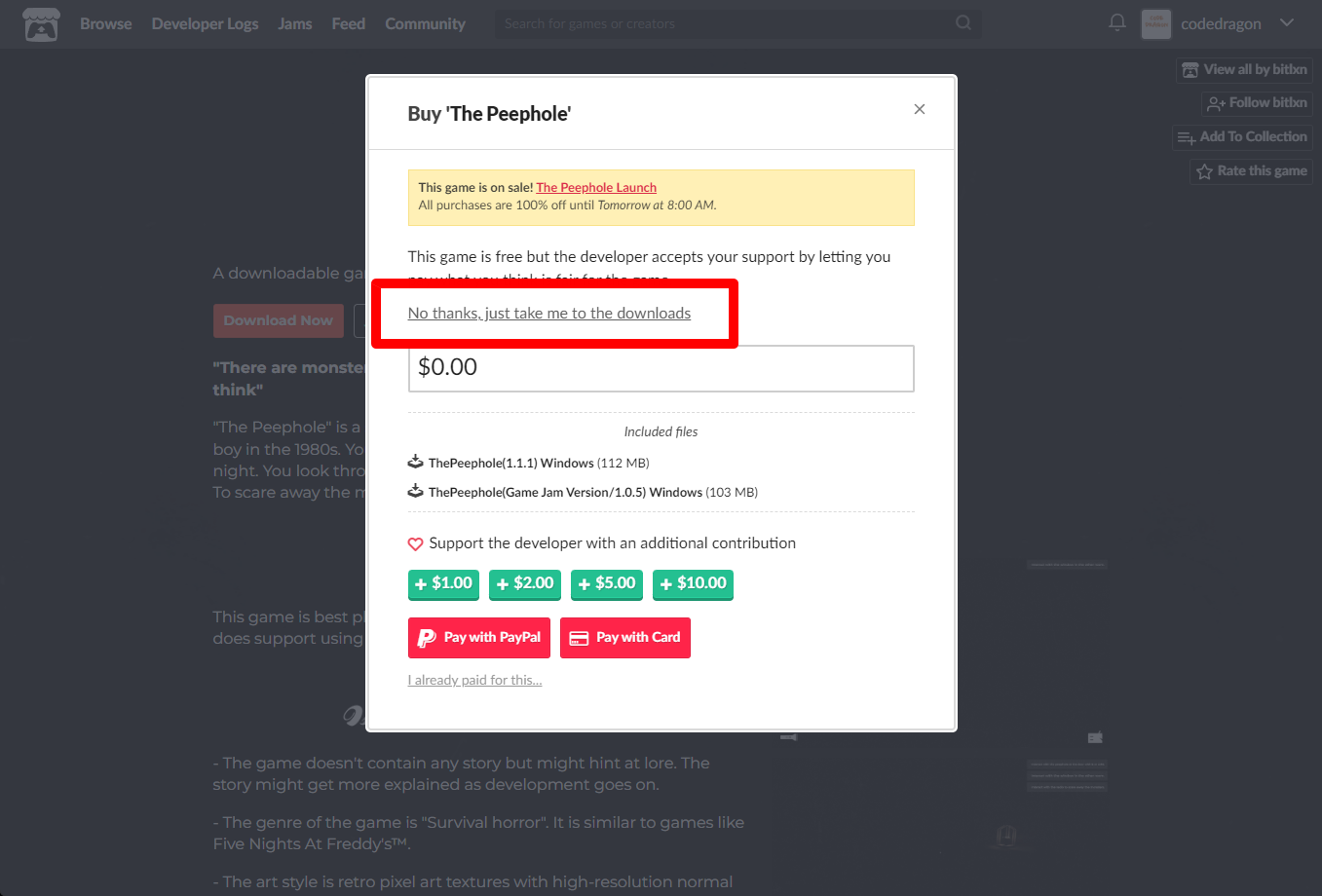 "The Peephole" 구매창에서 [No thanks, just take me to the downloads] 링크를 클릭합니다.