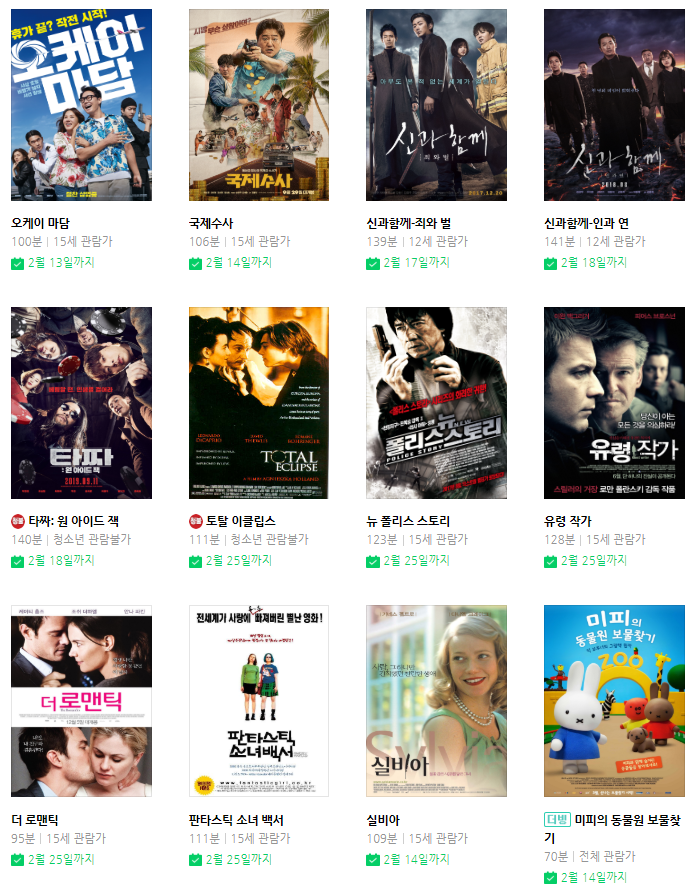2월 2째주 이번 주 무료 영화 - 오케이 마담, 국제수사, 신과함께-죄와 벌, 신과함께-인과 연, 타짜: 원 아이드 잭, 토탈 이클립스, 뉴 폴리스 스토리, 유령 작가, 더 로맨틱, 판타스틱 소녀 백서, 실비아, 미피의 동물원 보물찾기 - 네이버 시리즈온 SERIES ON
