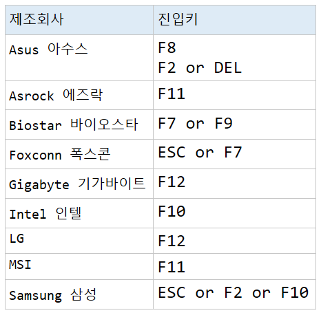 제조사별 BIOS 부트(Boot)메뉴화면에 진입할 수 있는 키입니다.