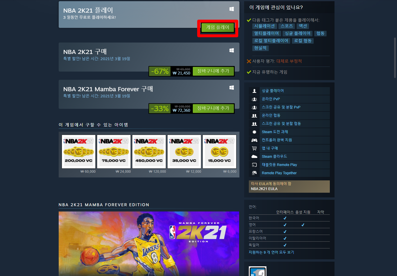 Steam 스팀 금주 무료 플레이 - NBA 2K21 Play for Free weekend on Steam 스팀