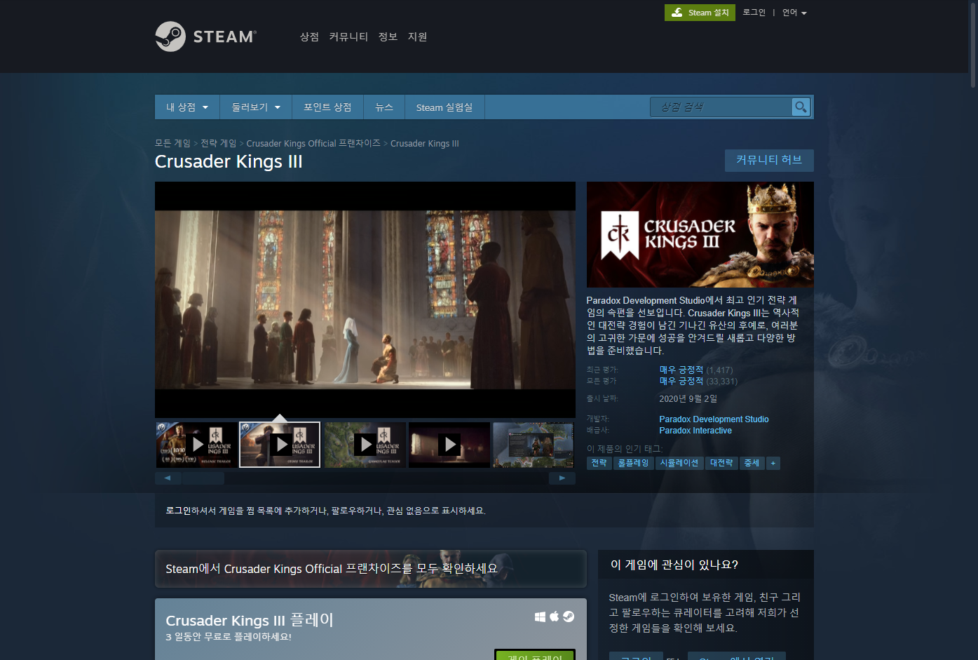 "Crusader Kings III 크루세이더 킹즈 3" 게임 페이지