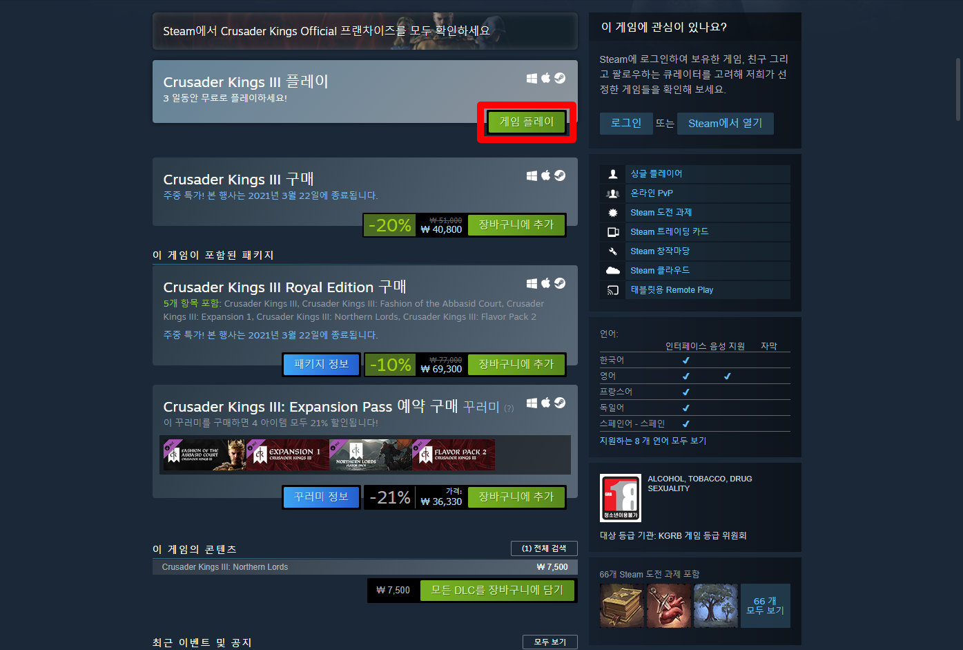"Crusader Kings III 크루세이더 킹즈 3" 게임페이지를 조금 내려서 [게임 플레이] 버튼을 클릭하면 됩니다.