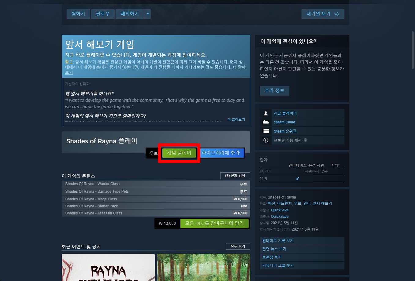 "Shades of Rayna" 페이지를 내려 [게임 플레이]를 클릭하면 됩니다.