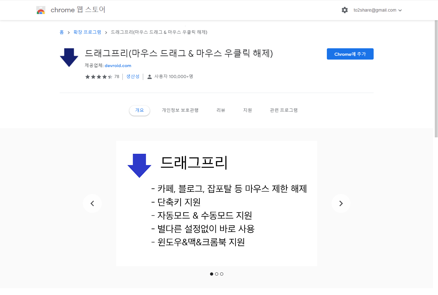 드래그프리(마우스 드래그 & 마우스 우클릭 해제) - Chrome 확장