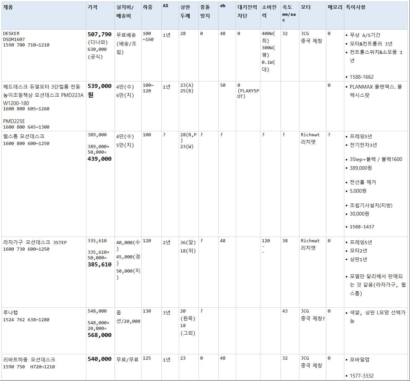 Standing Desk, 스탠딩데스크, 모션데스크 비교 크기 1600 기준