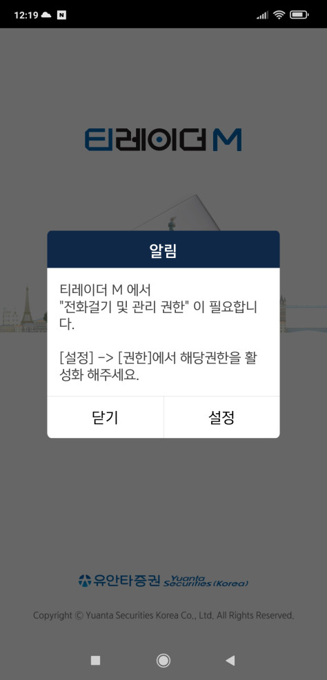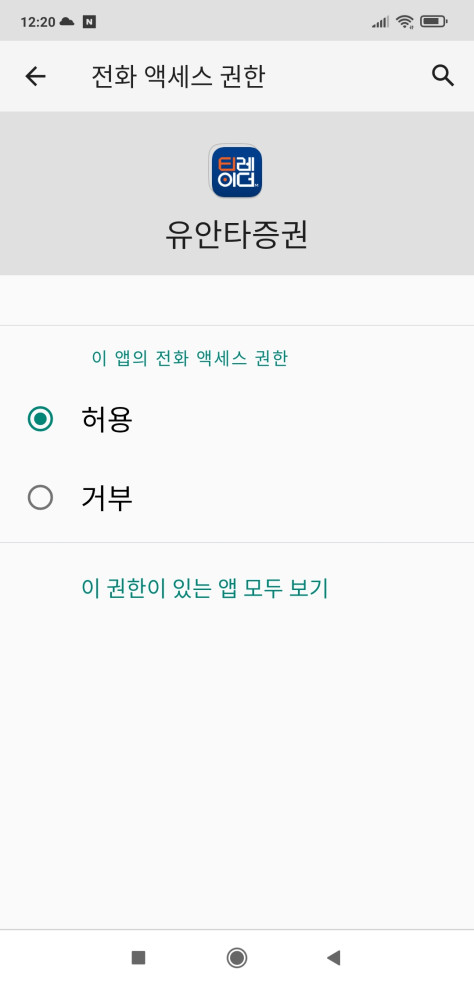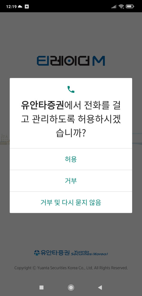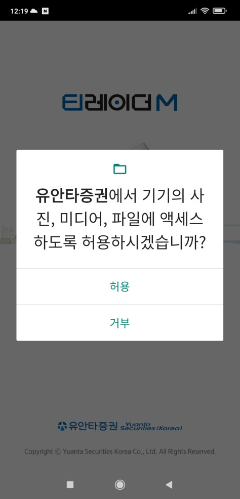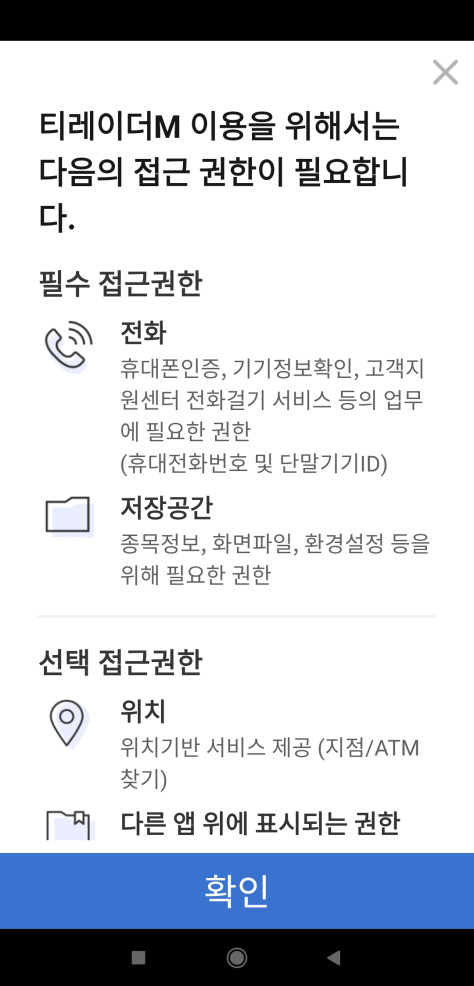 유안타증권앱을 이용하기 위해서는 필수 앱 접근권한(전화, 저장공간)을 허용해 주어야 합니다.