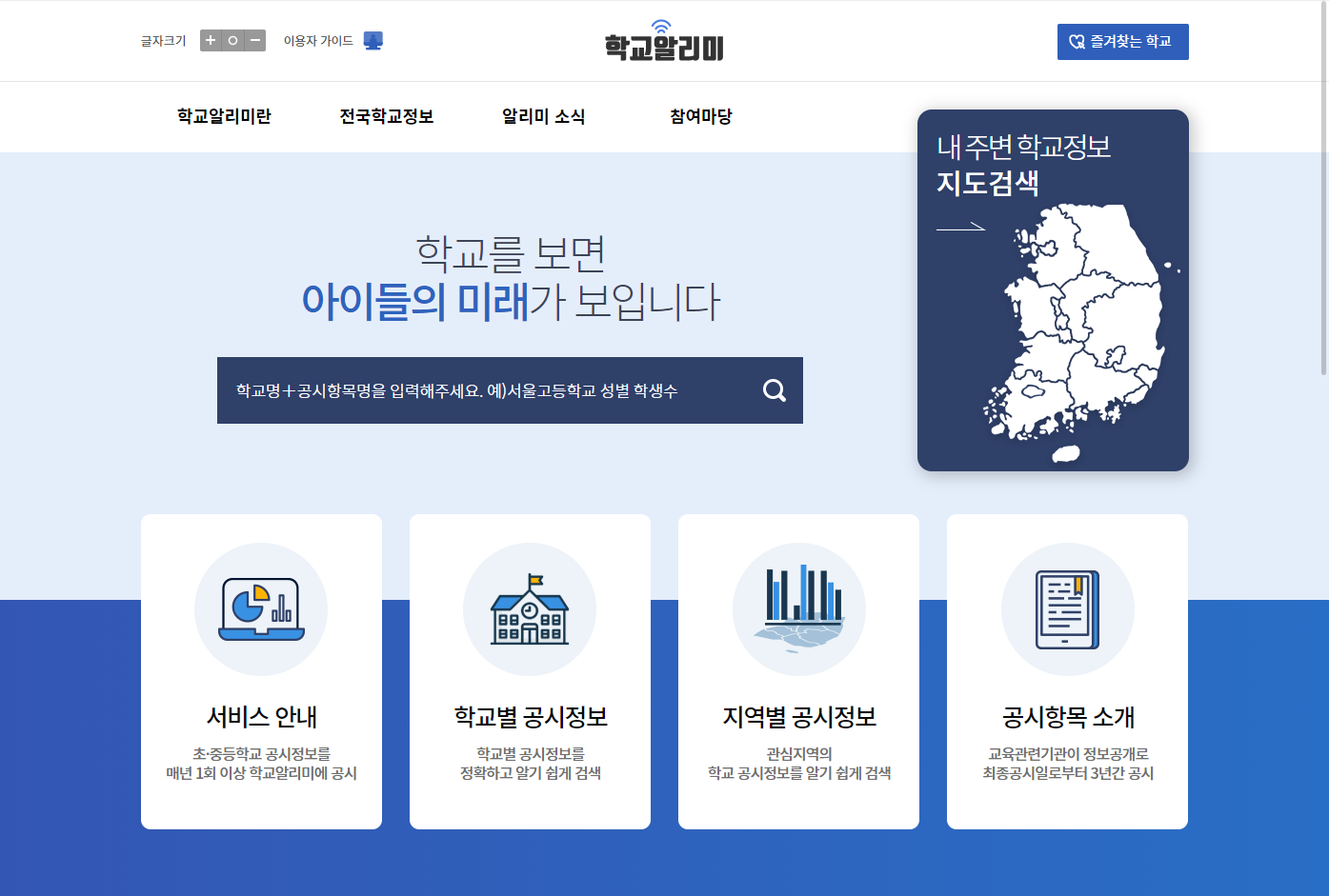 - 학생·교원현황·시설·학교폭력발생현황·위생·교육여건·재정상황·급식상황·학업성취 등과 같은 학교의 주요 정보들을 확인할 수 있습니다.