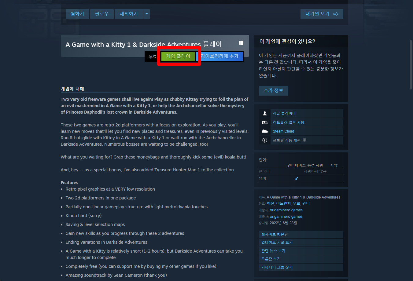 "A Game with a Kitty 1 & Darkside Adventures" 페이지를 내려 [게임 플레이]를 클릭하면 됩니다.