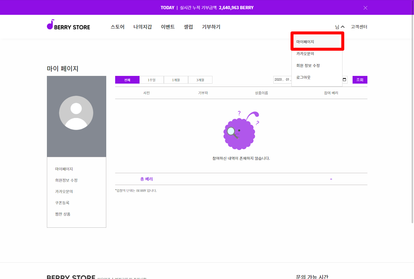 나오는 메뉴에서 [마이페이지]를 클릭합니다.