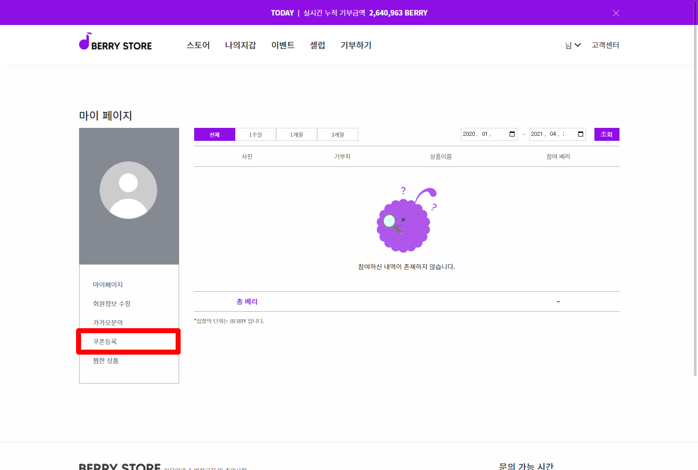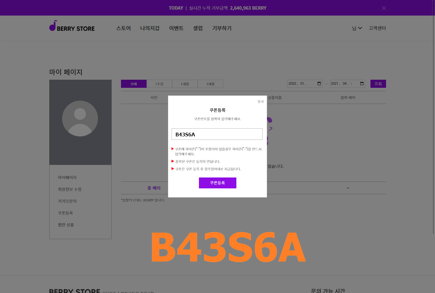 아래방법을 따라서 쿠폰코드 등록하면 100베리를 받을 수 있습니다.