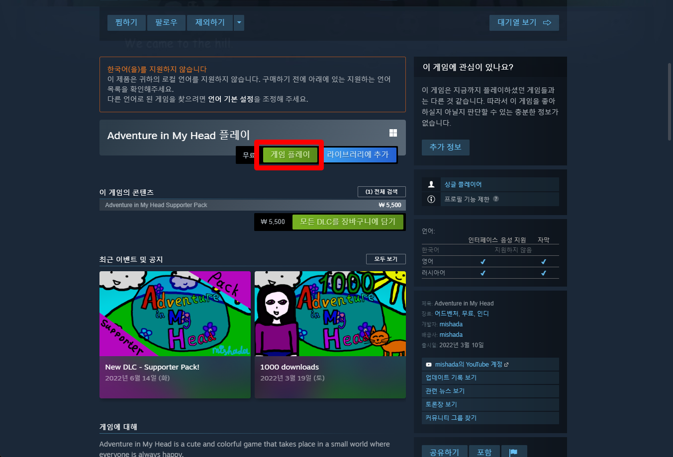 "Adventure in My Head" 페이지를 내려 [게임 플레이]를 클릭하면 됩니다.
