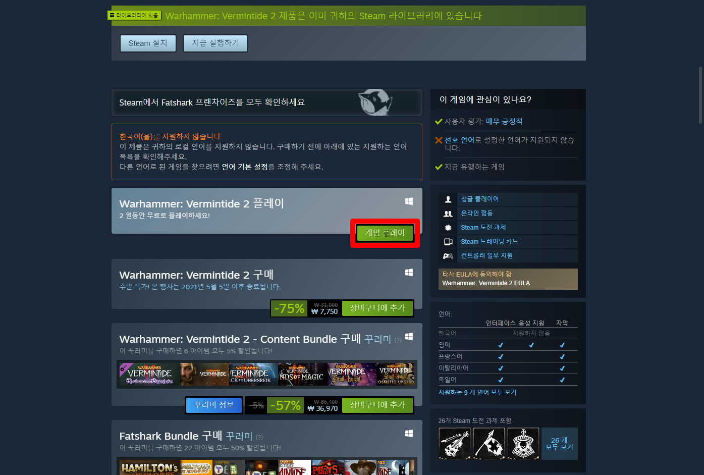 "Warhammer: Vermintide 2" 게임페이지를 조금 내려서 [게임 플레이] 버튼을 클릭하면 됩니다.