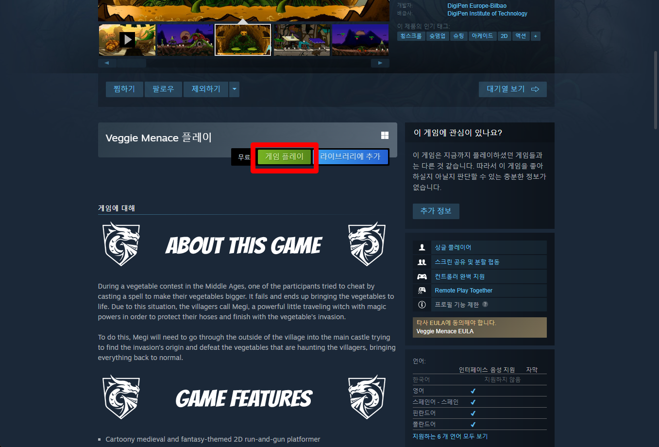 "Veggie Menace" 페이지를 내려 [게임 플레이]를 클릭하면 됩니다.