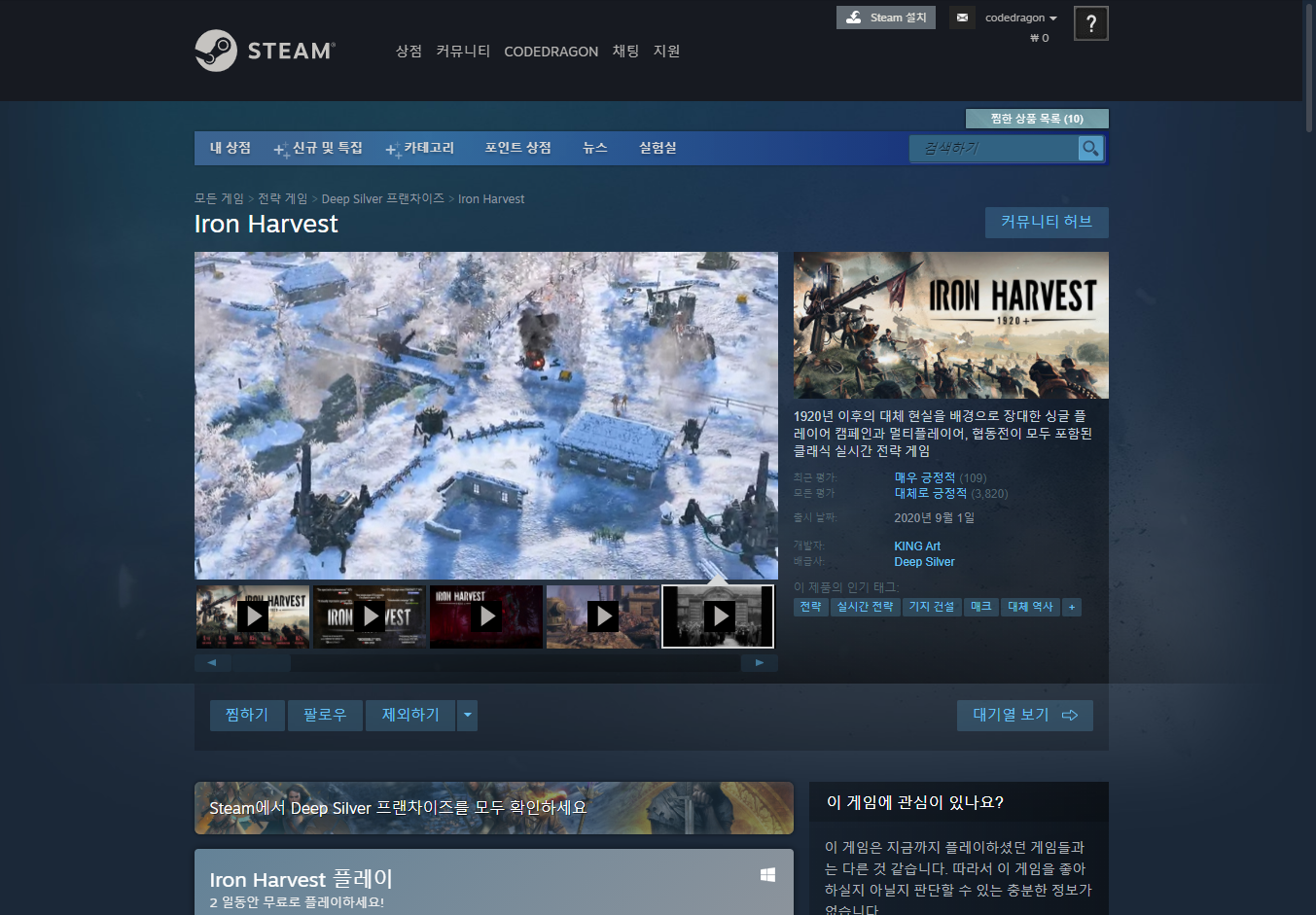 "Iron Harvest" 게임페이지를 조금 내려서 [게임 플레이] 버튼을 클릭하면 됩니다.