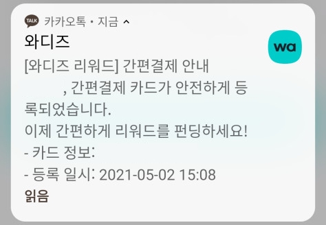 등록이 완료되면 간편결제 등록된 것을 카카오톡 알림 메시지로도 알려줍니다.