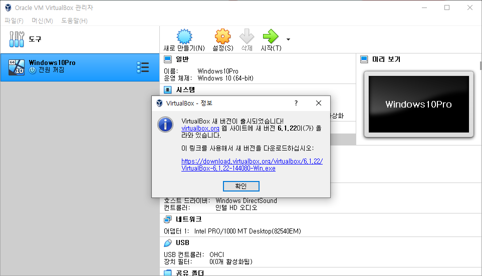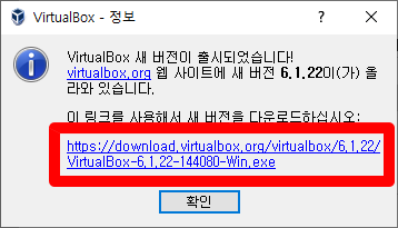 VirtualBox를 실행하면 최신버전이 있음을 팝업창으로 알려줍니다.