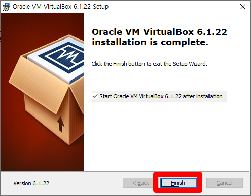 [Finish] 클릭하면 모든 업데이트 설치가 완료되고 최신버전이 적용된 VirtualBox가 실행됩니다.