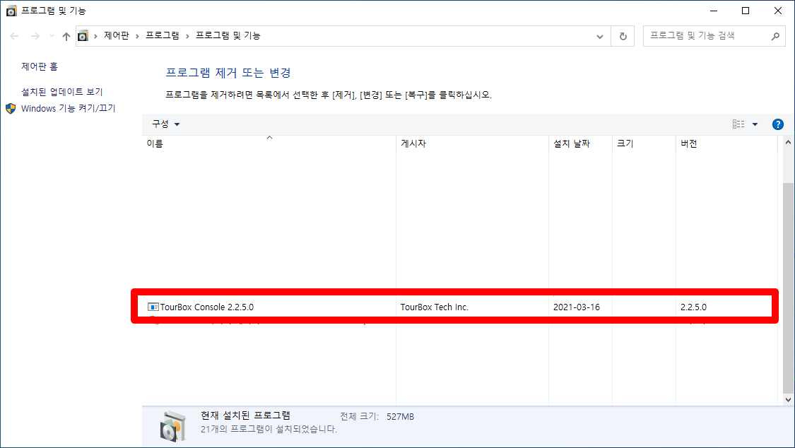 "프로그램 제거 또는 변경" 설정창이 오픈되면 "TourBox" 항목을 찾아서