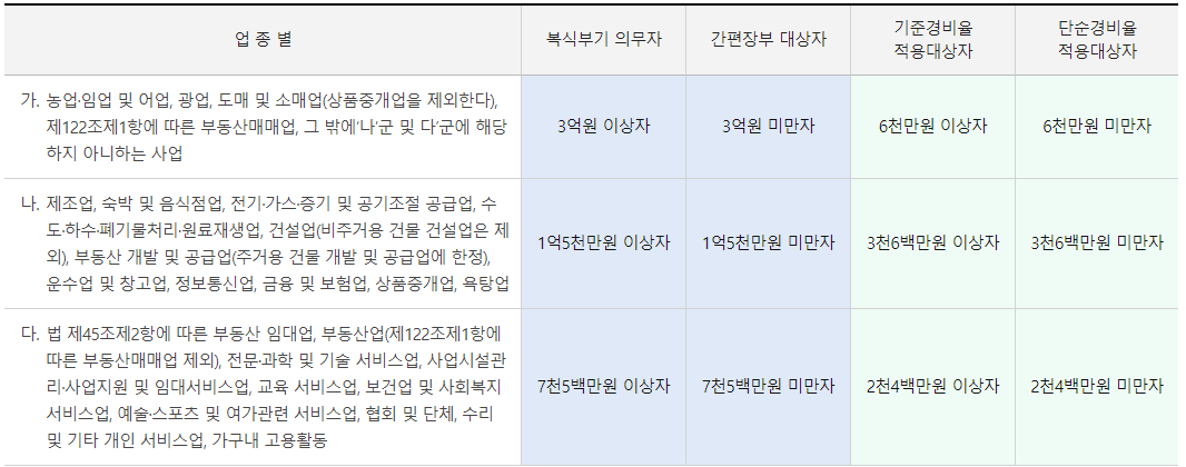 * 욕탕업은 기장의무 판단시에만 ‘나’군 적용, 경비율 기준은 ‘다’군 적용