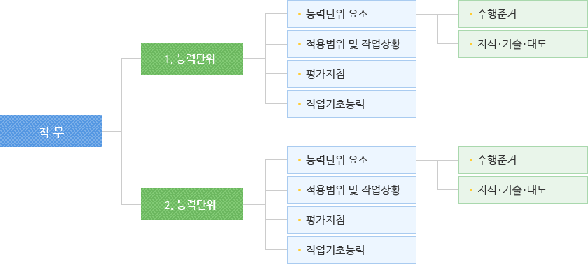 능력단위요소(수행준거,지식·기술·태도), 적용범위 및 작업상황, 평가지침, 직업기초능력으로 구성됩니다.