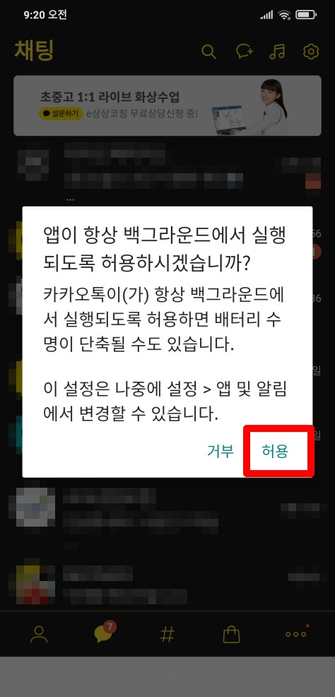 [허용] 클릭하면 카카오톡앱이 백그라운드에서 실행되어 있어 카카오톡 메시지가 오면 바로바로 알려주게 됩니다. 하지만 계속 실행되어 있으므로 밧데리 사용량은 실행하지 않을 때보다 많겠죠.