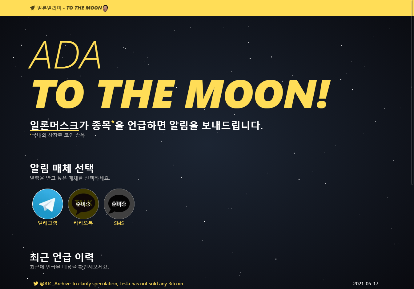 일론머스크가 국내외 상장된 코인 종목을 언급하면 알림을 보내주는 곳입니다.