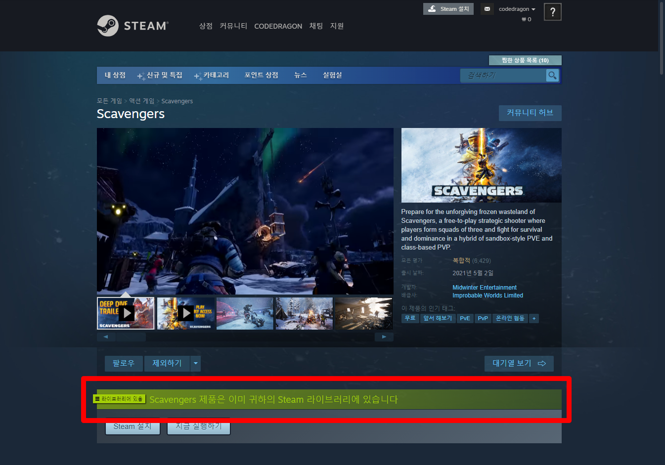 게임정보에 보면 녹색으로 "라이브러리에 있음"으로 표시되어 있어 나의 게임 라입러리에 추가되어진것 확인할 수 있습니다.