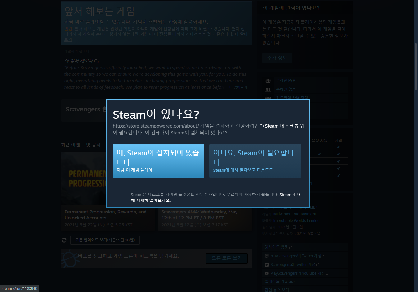 스팀런처 설치유무에 따라 예, 아니오 클릭합니다.